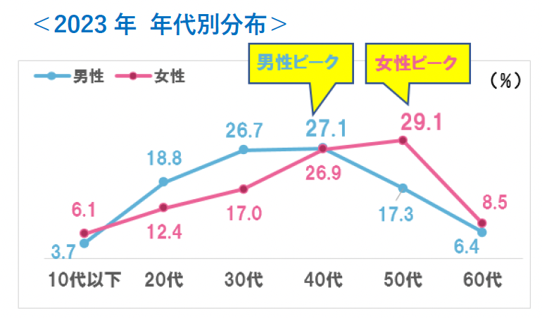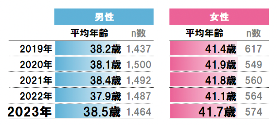 薄毛が気になりだした平均年齢は、男女ともほぼ横ばい。男性は女性よりも薄毛が気になりだす年齢が早い。年代別分布からは、男性は40代がピークで50代に大きく減少。一方、女性は50代から気になりだす人が増える。