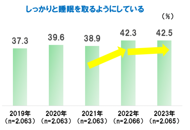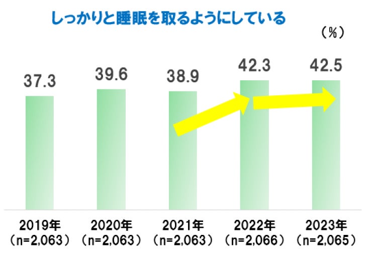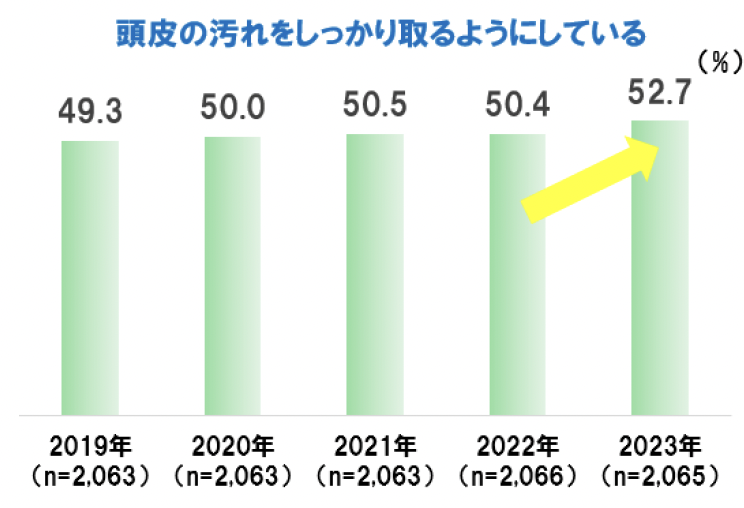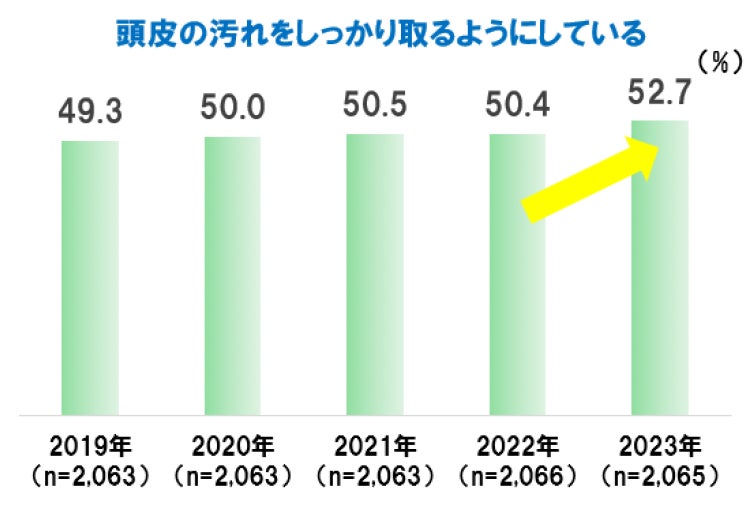 「頭皮の汚れをしっかり取るようにしている」は過去5年でスコアが上昇傾向にある。2022年から2023年には、2.3ポイント上昇。「しっかりと睡眠を取るようにしている」は2022年以降、スコアが上昇している。