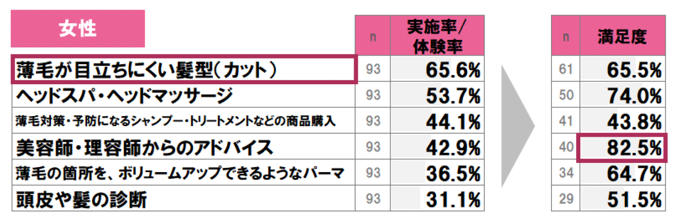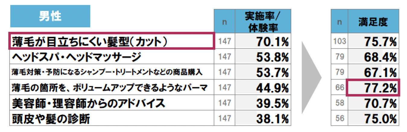 男女ともに実施率/体験率が最も高いのは「薄毛が目立ちにくい髪型」。一方、最も満足度の高いメニューは男性では「薄毛の箇所を、ボリュームアップできるようなパーマ」、女性では「美容師・理容師からのアドバイス」で、実施率/体験率に対する満足度が高くなっている。