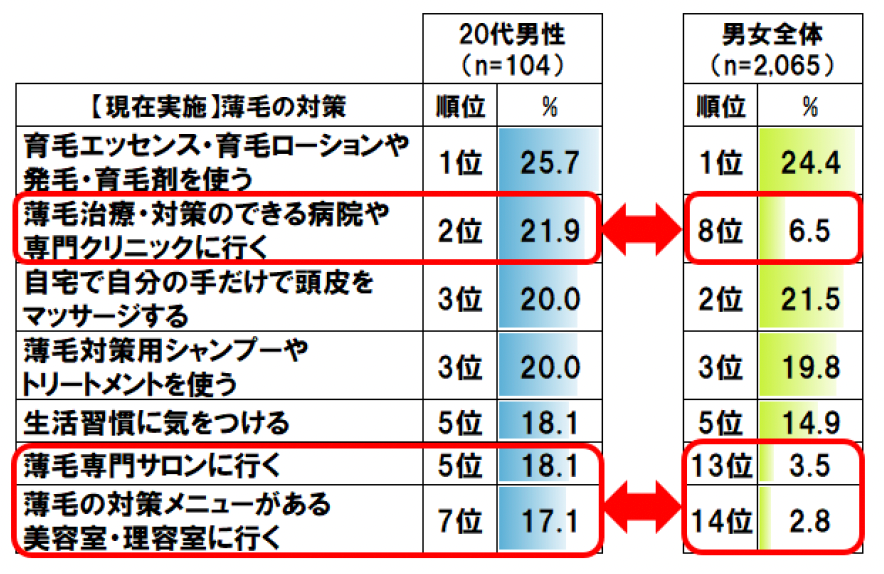 薄毛対策費用は、20代男性がけん引!月額8,893円で、「薄毛専門クリニック」など専門機関への投資が高め