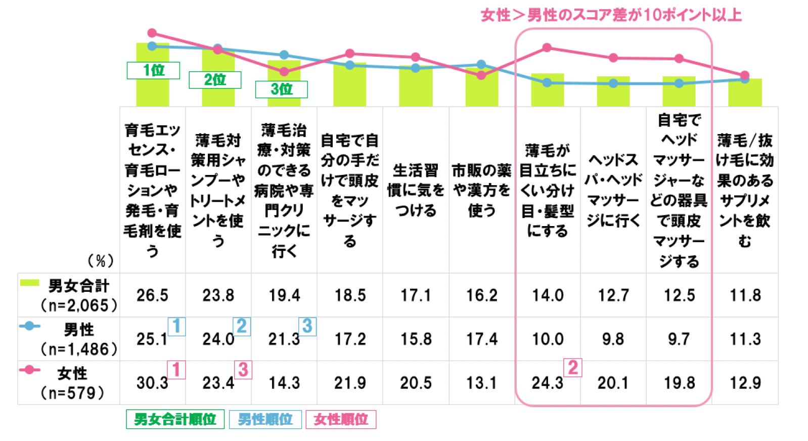 1位は男女ともに「育毛エッセンス・育毛ローションや発育毛剤を使う」。女性のスコアが男性を大きく上回るのが「薄毛が目立ちにくい分け目・髪型にする」、「ヘッドスパ・ヘッドマッサージに行く」、「自宅でヘッドマッサージャーなどの器具で頭皮マッサージする」で、男性のスコアに対してそれぞれ10ポイント以上を上回っている。