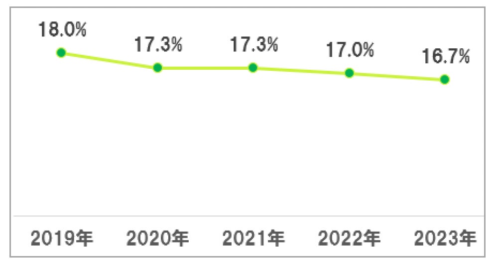 薄毛である人の割合は16.7%。過去5年では緩やかな減少傾向。