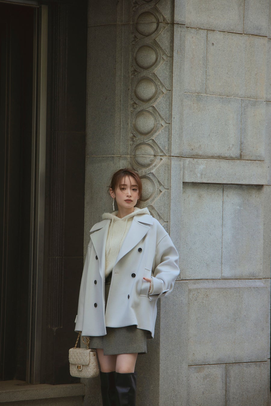 Coat ¥42,900 / Knit tops ¥17,600 / Skirt ¥17,600 / Pierced earrings ¥8,250 / Bag【Online Limited】 ¥13,640 / Shoes ¥24,200