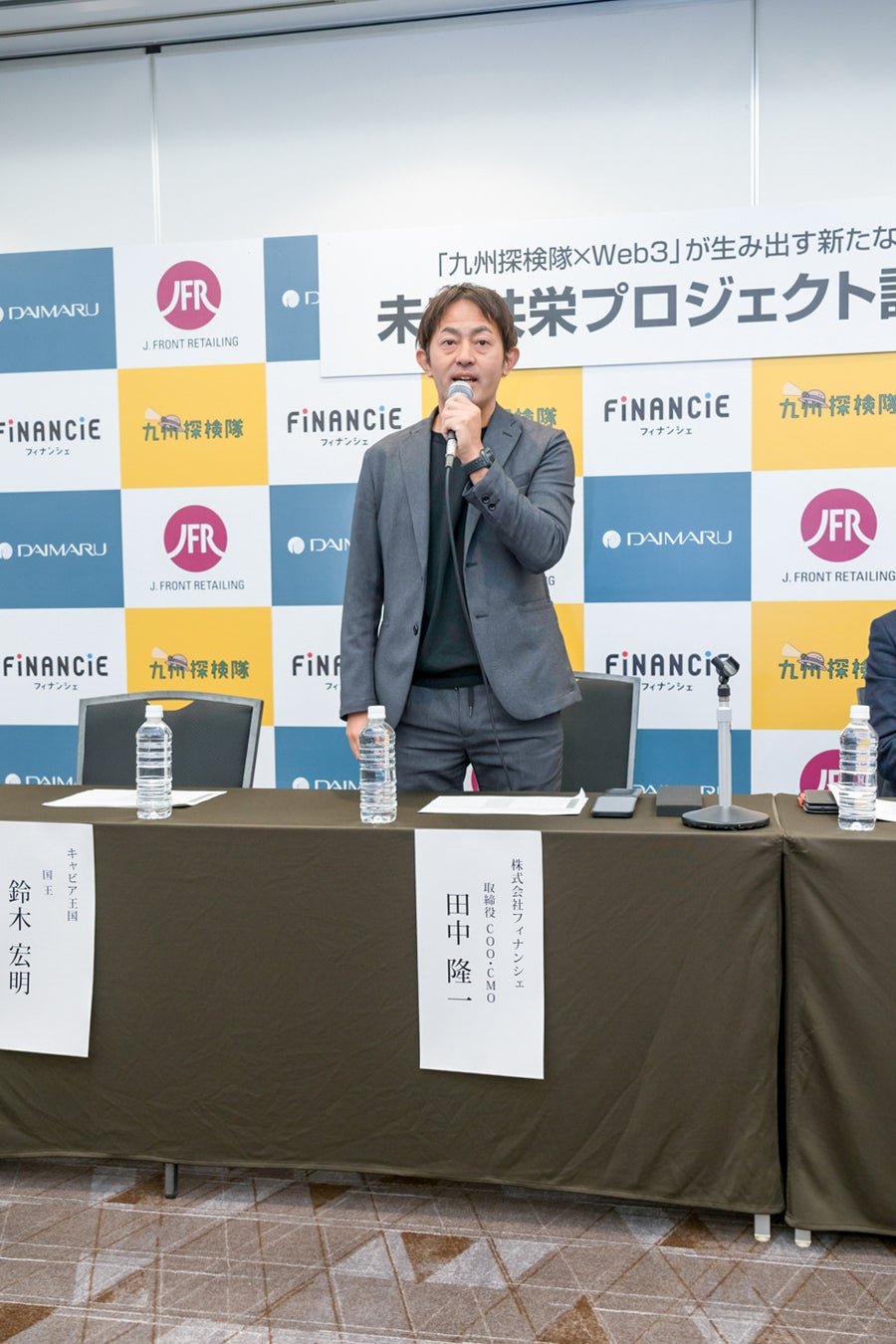 記者発表では、J.フロント リテイリング 執行役常務 グループデジタル統括部長の林直孝より、J.フロン ト リテイリングの目指す、地域と共生する街づくりやフィナンシェとの資本業務提携による取組みについて説明しました。また、博多大丸 取締役 営業統括部長の村本光児が、生産者の夢を叶える資金調達と共創する仲間づくりを支援する「未来共栄プロジェクト」を発表しました。