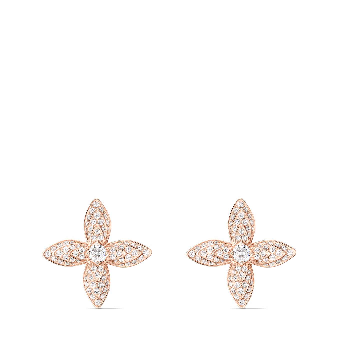 当初、ホワイトゴールドとダイヤモンドの組み合わせで登場した、スレンダーなモノグラム·フラワーが、今回は目を奪われるほど魅惑的に輝く、ローズゴールドの新しいバリエーションとなって姿を現します。強く光輝くペンダント、顔周りを瞬く間に輝かせる優美で洗練されたピアス、目を見張るほどに壮麗な唯一無二のリングの中心で、モノグラム·フラワーが咲き誇っています。