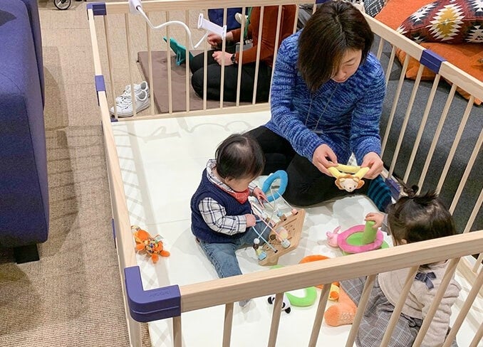 お子様連れでもママが安心して学習できるように、キッズスペースを設置しおもちゃをご用意。ビル内には多目的トイレも設置されており、赤ちゃんのオムツ替えスペースや授乳スペースとしてもご活用いただけます。