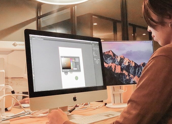 24時間いつでも視聴可能な映像教材を活用し、制作の基礎となる学習ができます。わからないところは現役のデザイナーから実践的な指導をSTUDIO校舎とオンラインで受けられます。制作指導以外にも雑談を通じて制作や仕事上のノウハウを知ることもできます。