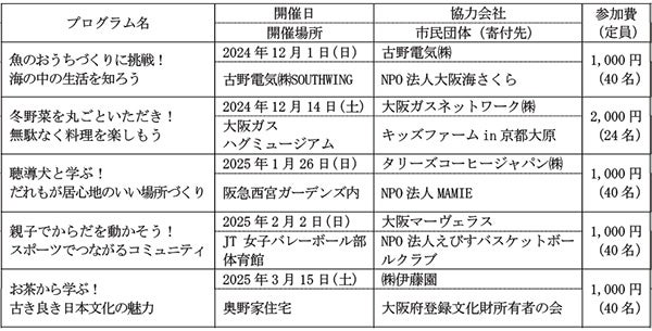 1.開催日・開催場所・協力会社・市民団体(寄付先)・参加費(こども1名)