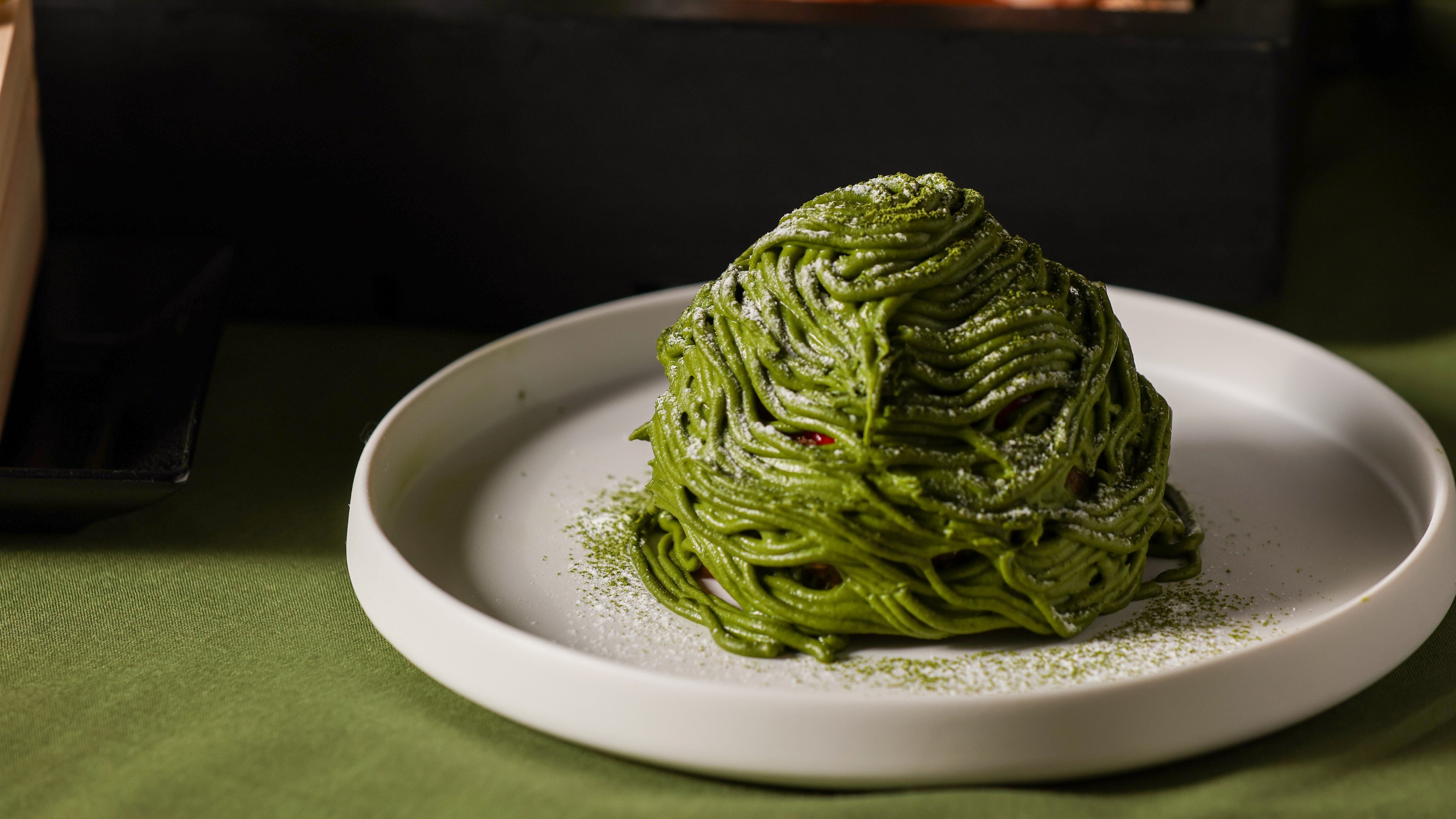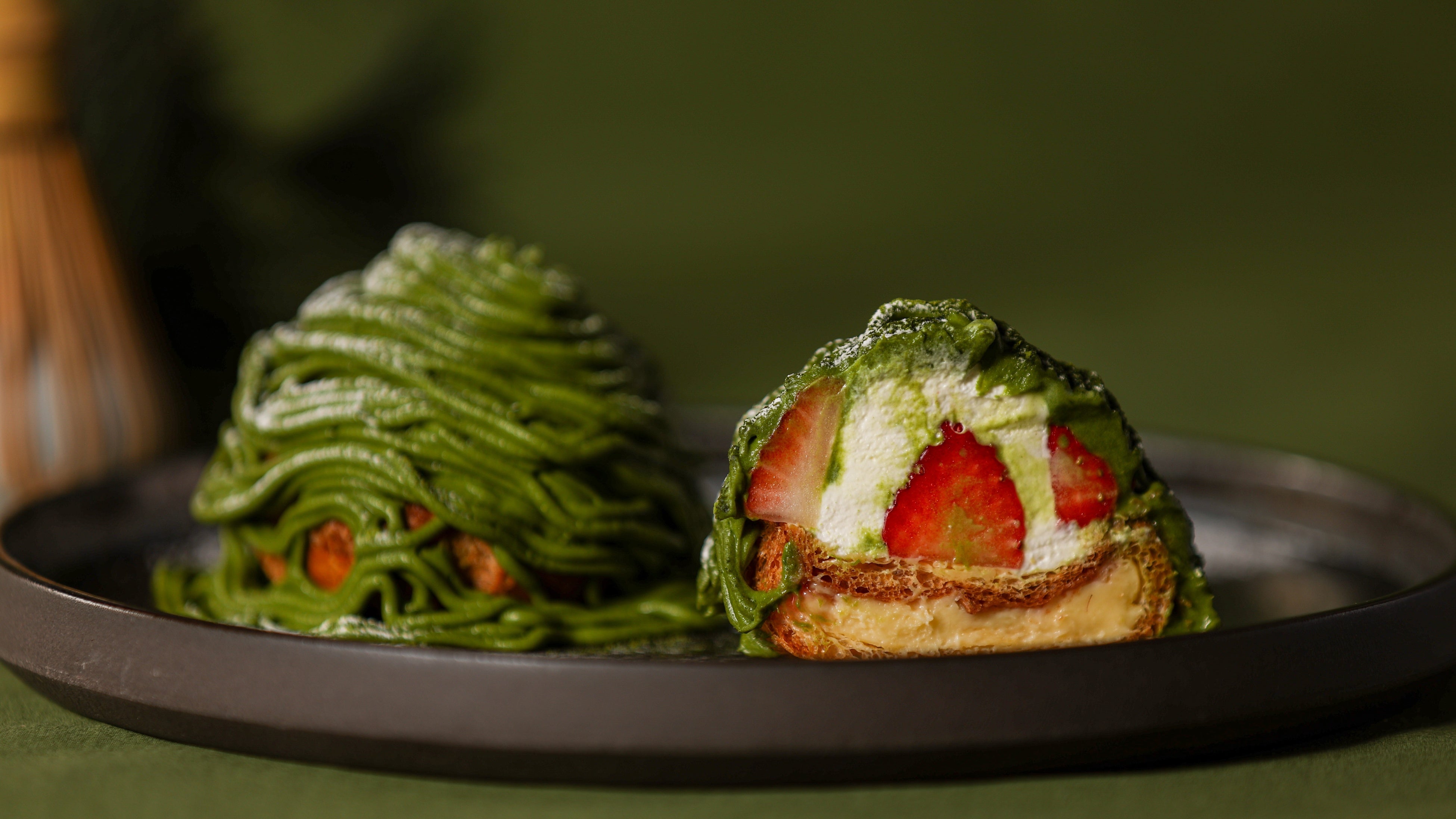 手毬寿司や抹茶そばなど“和”の要素を取り入れ、見た目も楽しいセイボリープレートに、香り高い抹茶を存分に味わえる贅沢な全7種のスイーツが、ラインアップ。さらに、抹茶のモンブランクリームを上から贅沢に絞ったスペシャリテ「抹茶シューモンブラン」は、抹茶クリームのほろ苦さやカスタードクリームの滑らかな触感、苺のジューシーな果肉が口いっぱいに広がる絶妙な逸品です。