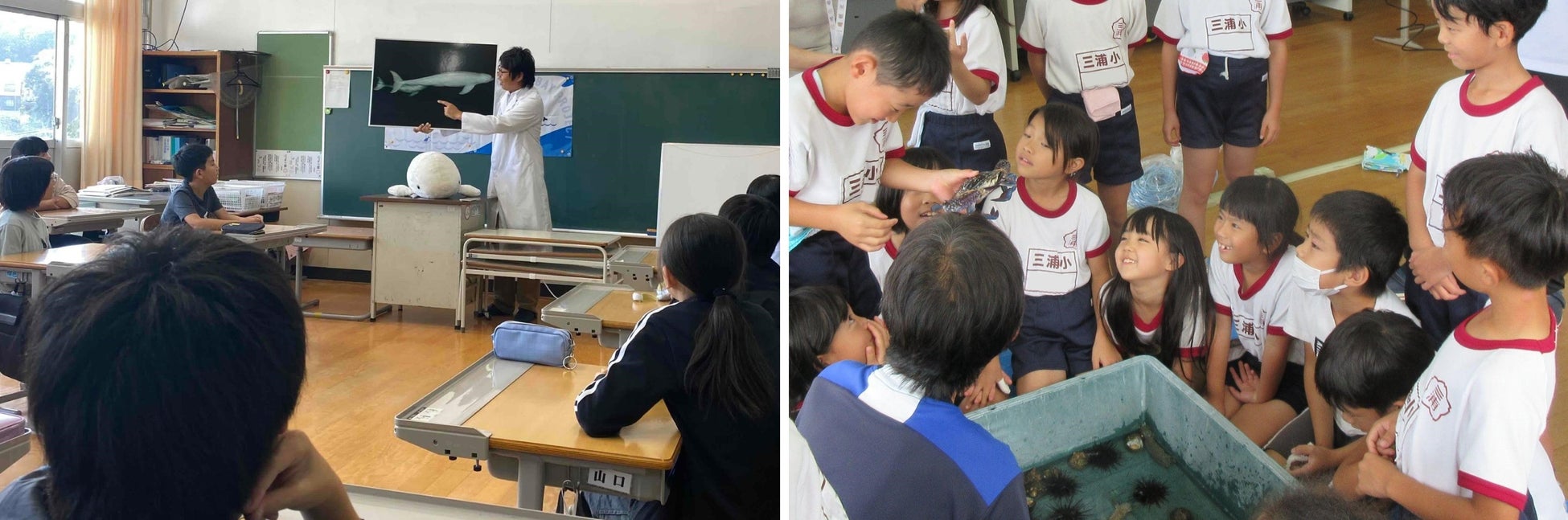 中でも子どもたちが大いに盛り上がったのは、大村湾に生息するイルカの仲間スナメリについてです。大村湾には約200頭のスナメリが生息していると言われますが、実際に見たことがある人はごく少数です。参加した子どもたちは「白いイルカがこんなに身近にいるの?」「見てみたい!」とワクワクした様子で語り合いました。プロのダイバーであり講師の中村氏が大村湾で撮影した写真には、産まれて1週間のスナメリの授乳の様子がありました。中村氏によると、スナメリは必ず海の中の同じ場所に同じ親がやってきて子育てをするそうです。参加した子どもたちは、自分たちと同じようにスナメリにとっても大村湾はふるさとなんだ、と喜び、より関心が高まったようでした。他にも開催場所によっては、タッチプールを備え大村湾の生き物を触ることができる出前授業もあり、実際の色、触感、温度を感じることで、子どもたちにとって海が身近な存在となりました。