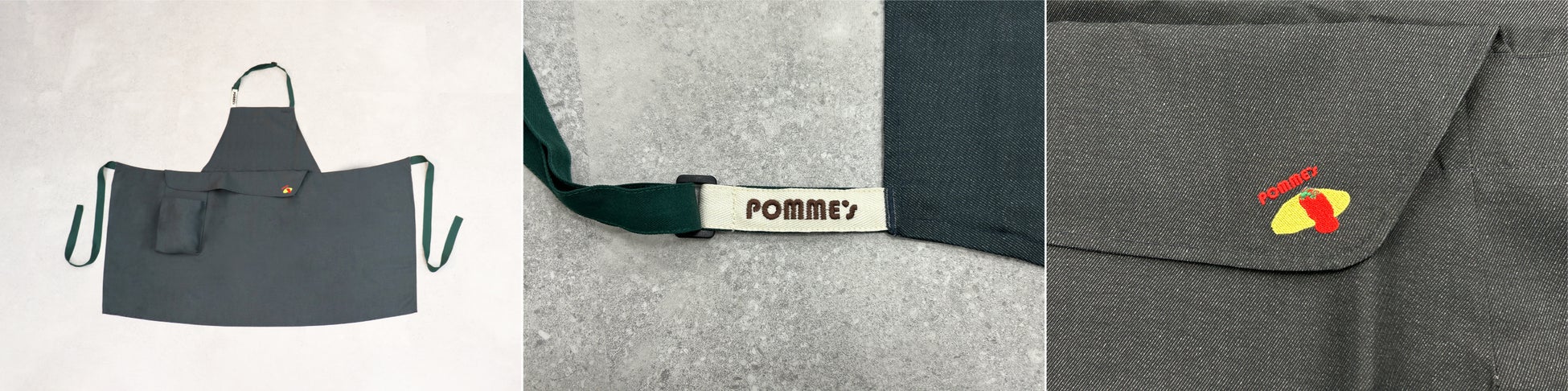 今回、制作にあたり、ポムの樹のオムライスへのこだわりやお客様はもちろん、そこで働く従業員も大切にする思いを伺い、オムライスづくりのプロフェッショナルが着用するユニフォームにもブランドを体現するデザインと高い技術力を最大限発揮できる快適な着心地を目指しました。