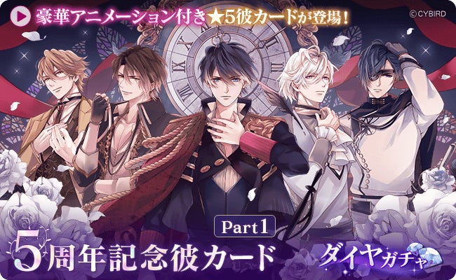 描き下ろしの5周年ビジュアルに、豪華アニメーションのついた美麗彼カードが、Part1~3に分かれて全キャラクターダイヤガチャに登場します。開催期間中は、5周年ビジュアルの彼カードの出現率が上がっていますので、ぜひこの機会に手に入れてください。