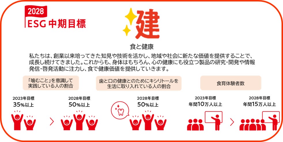 ロッテは「噛むこと」の健康に対する効用を長年研究し、啓発活動を行っております。また、キシリトールを用いた幼児期のむし歯予防などの活動にも取り組んでおります。近年では、ESGの中期目標として「噛むこと」を意識して実践している方の割合、および、歯と口の健康維持、むし歯予防のために「キシリトール」を生活に取り入れている人の割合を、2028年までに50%(国内)にすることを掲げて活動を展開してまいりました。