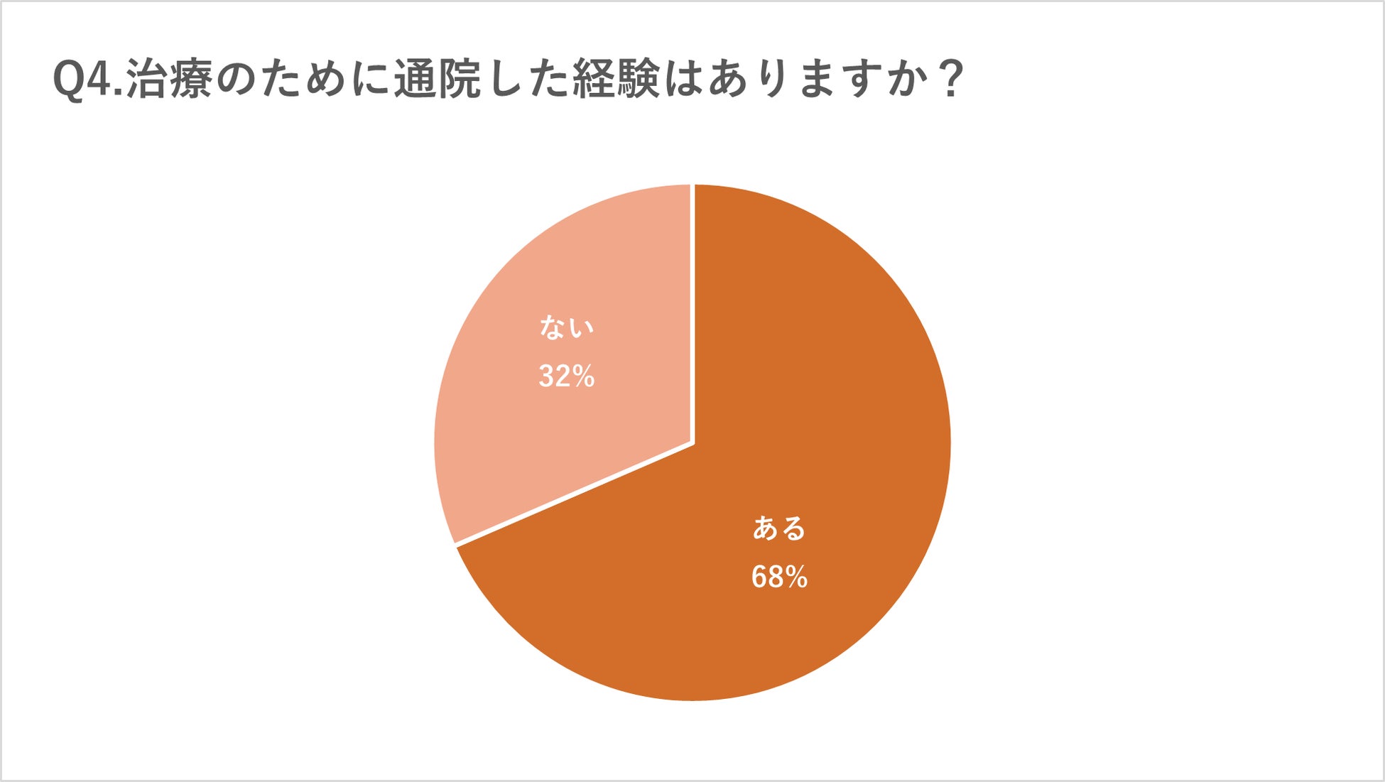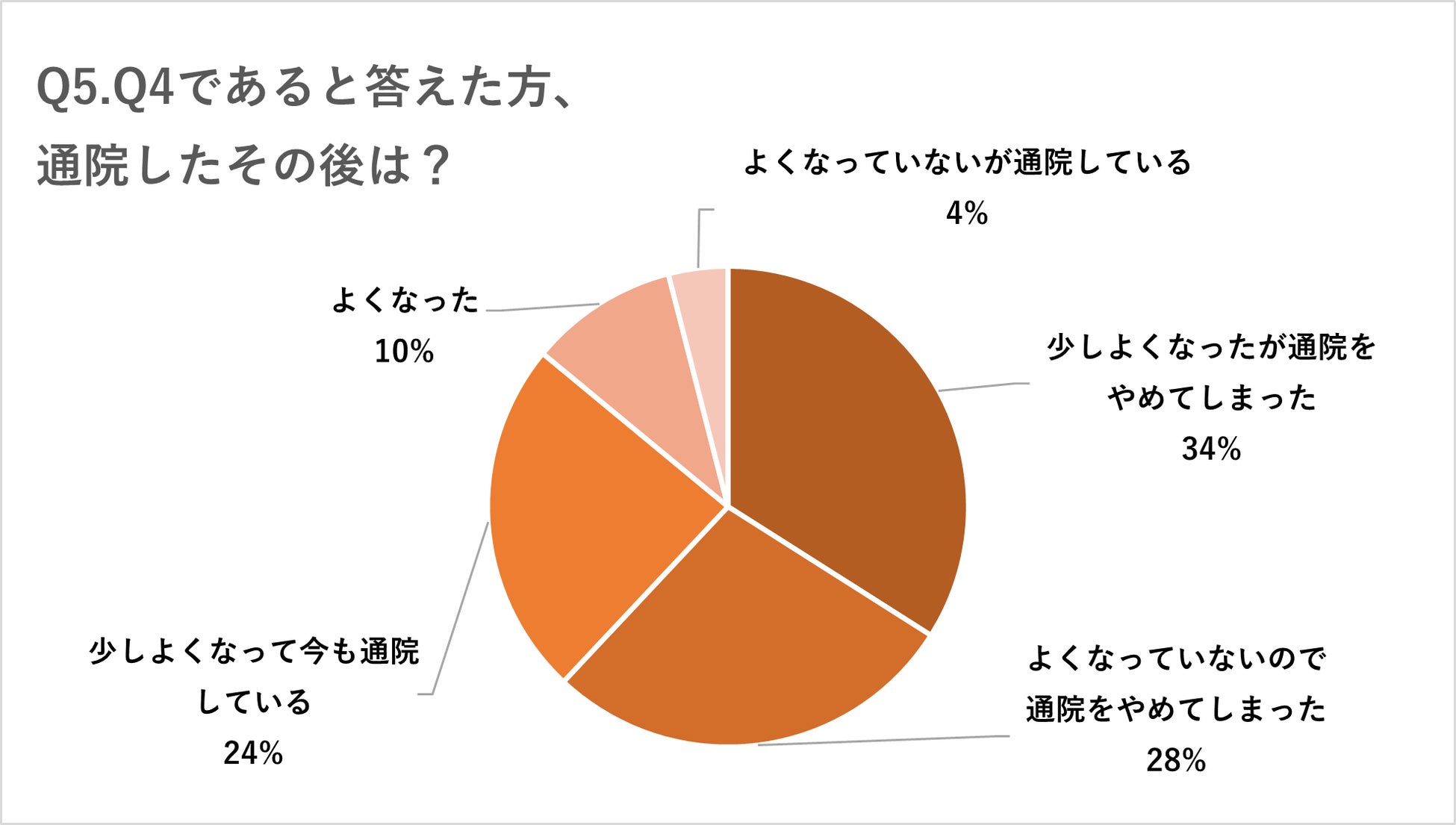 一方、「よくなった(10%)」「少しよくなって今も通院している(24%)」と改善効果を感じている人は3割程度にとどまりました。