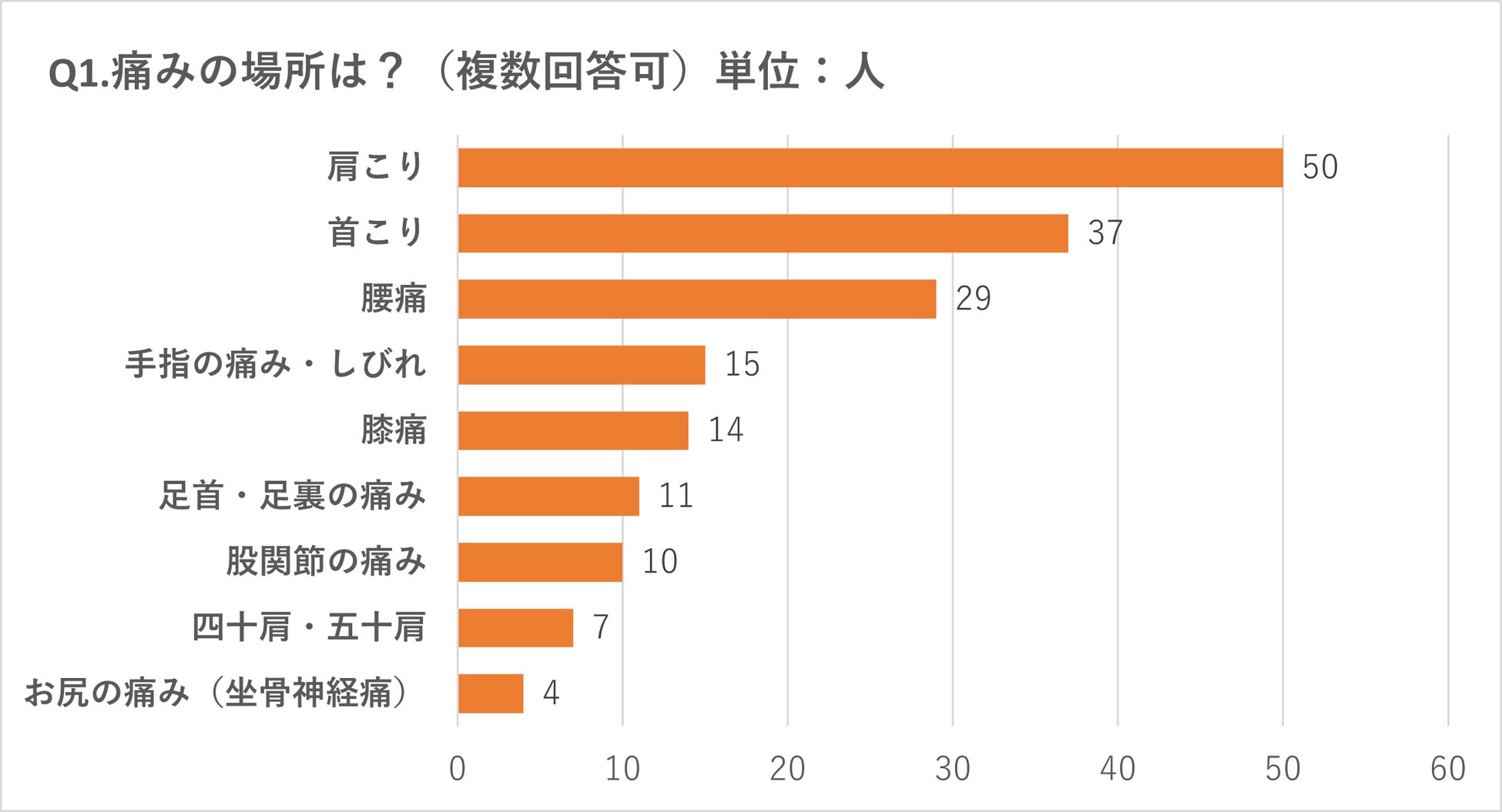 慢性痛がある部分の上位は、1位「 肩こり」、2位「首こり」、3位「腰痛」。いまの日本人の3大慢性痛といっても過言ではないでしょう。次いで「手指の痛み・しびれ」、「膝痛」となっています。
