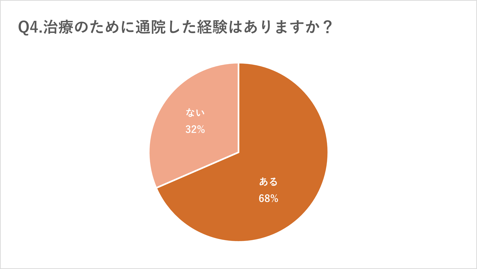 あると答えた人が約7割にのぼりますが、ない人も3割いました。99%の人が慢性痛をガマンしていると回答していることもあるように(Q2)、慢性痛があっても何もケアしていない人も少なくないようです。