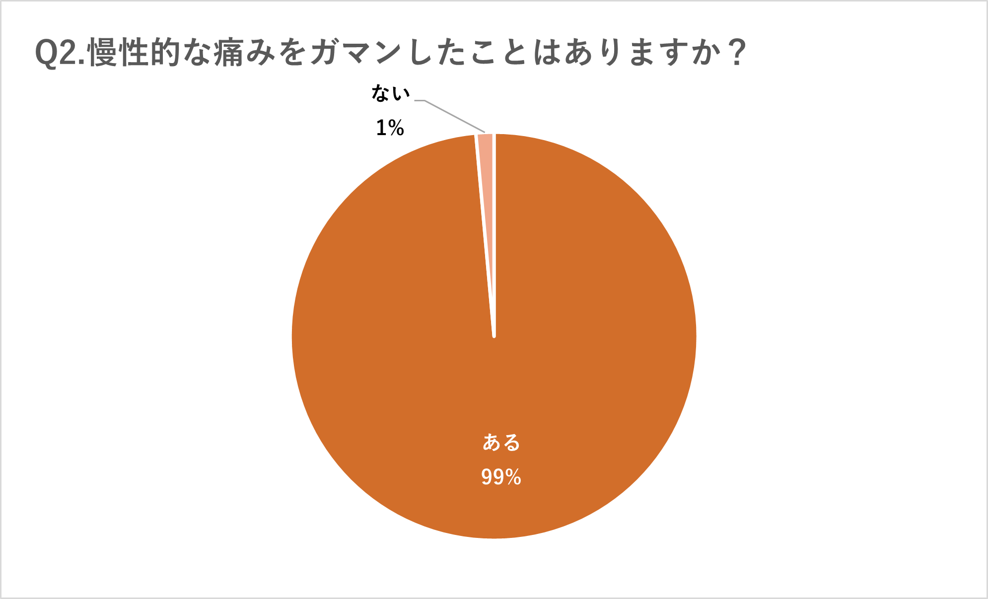 なんと99%の人が慢性的な痛みをガマンしたことがあると回答しました。痛みがありながらもガマンしながらだましだまし生活している人のなんと多いことでしょう。
