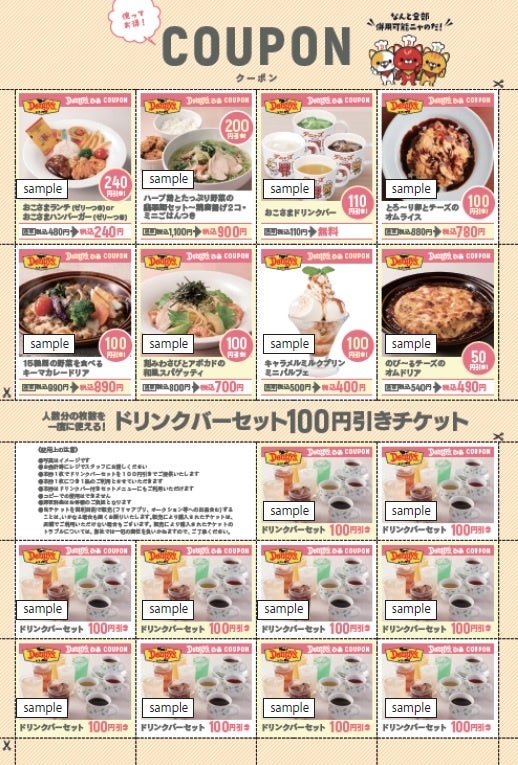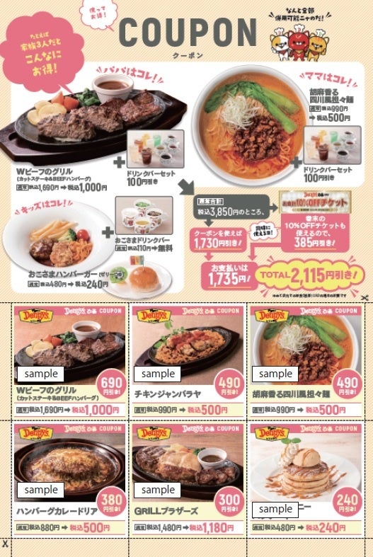 | <お得な特典の使い方を伝授!> 例えば家族3人で訪れた場合 パパ Wビーフのグリル(カットステーキ&BEEFハンバーグ) 通常税込1,690円⇒税込1,000円 ドリンクバーセット100円引き ママ 胡麻香る四川風担々麺 通常税込990円⇒税込500円 ドリンクバーセット100円引き キッズ おこさまランチ(ゼリーつき)通常税込480円⇒税込240円 おこさまドリンクバー 通常税込110円⇒無料 通常合計3,850円のところクーポンを使えば1,730円引き、さらに10%OFFチケットも使えるので385円引き! 支払い額は1,735円で合計2,115円もお得に! ※全て店内での飲食(税率10%)の場合の計算です。 |