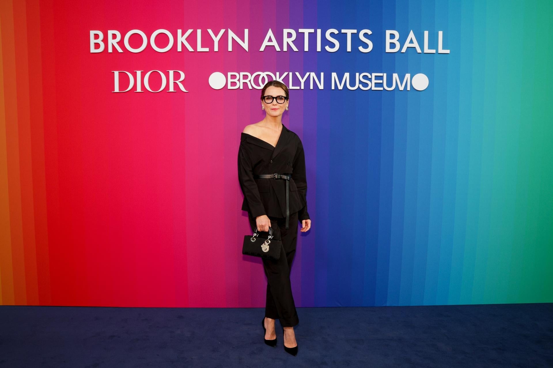 ケリー・ラッセルは2025年春夏 コレクションより、ブラックのシルクジャケットとパンツに、のベルト、バッグ、シューズを合わせたルックで登場しました。