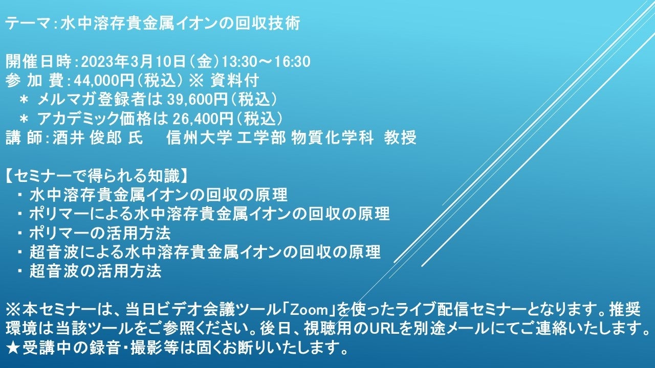 先端技術情報や市場情報を提供している(株)シーエムシー・リサーチ(千代田区神田錦町: https://cmcre.com/ )では、 各種材料・化学品などの市場動向・技術動向のセミナーや書籍発行を行っておりますが、 このたび「水中溶存貴金属イオンの回収技術」と題するセミナーを、 講師に酒井 俊郎 氏 (信州大学 工学部 物質化学科 教授)をお迎えし、2023年3月10日(金)13:30より、 ZOOMを利用したライブ配信で開催いたします。 受講料は、 一般:44,000円(税込)、 弊社メルマガ会員:39,600円(税込)、 アカデミック価格は26,400円(税込)となっております(資料付)。