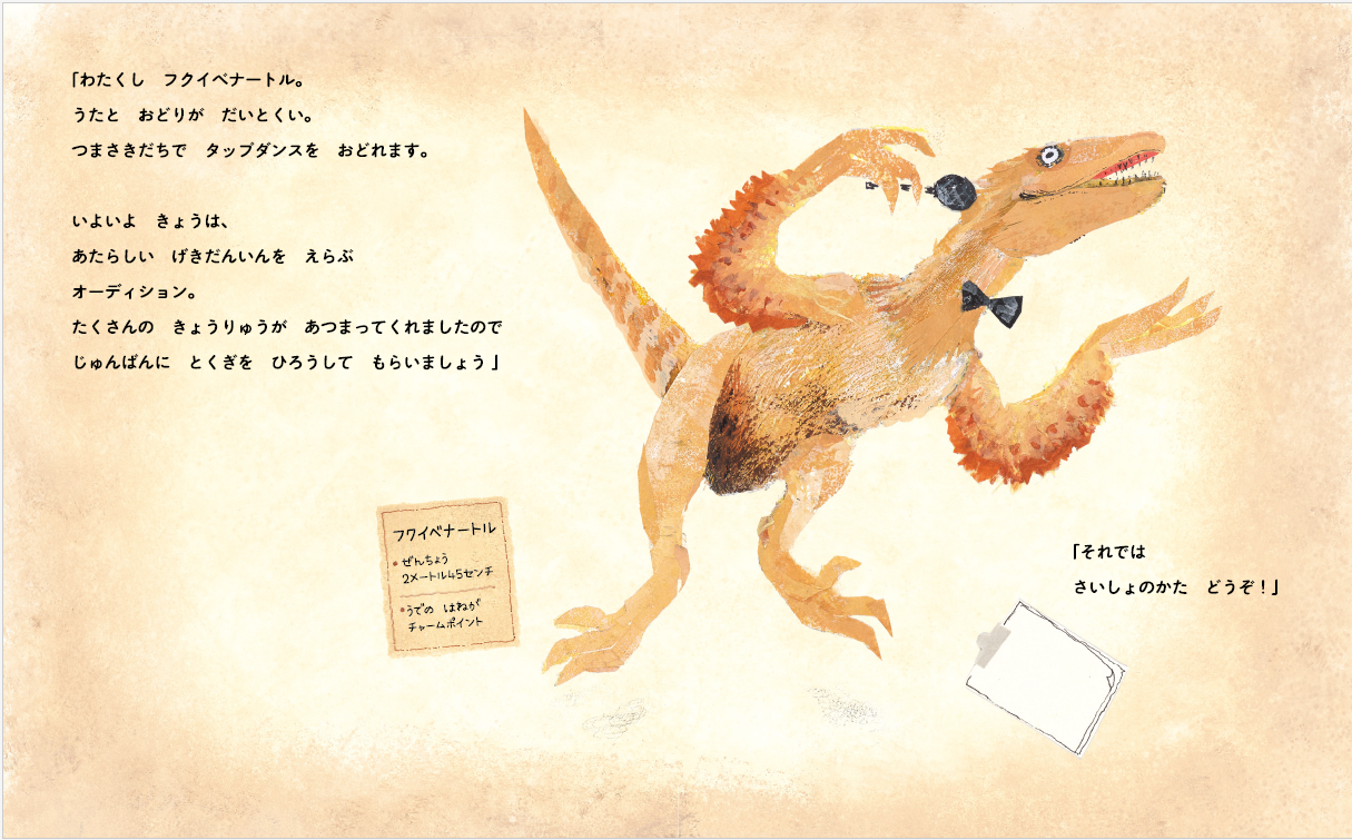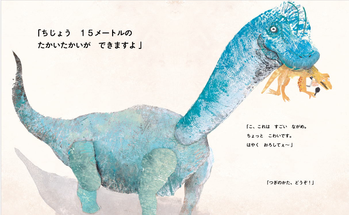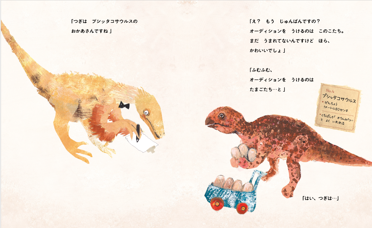 たしろ氏は現在『きょうりゅうオーディション』の続編、『きょうりゅううんどうかい』を制作中。どちらも、ひとりひとりの個性の輝きを尊重する内容で、弱肉強食とは無縁の、ほっこりほのぼのと楽しめる恐竜絵本になっています。