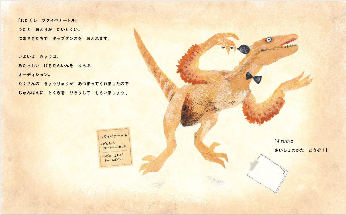 『きょうりゅうオーディション』に登場するフクイベナートル。蝶ネクタイをつけています。