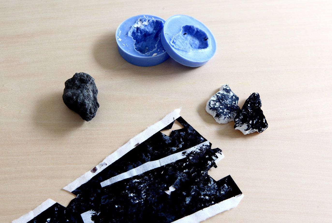 発掘された化石と、その模様を写し込んだ紙