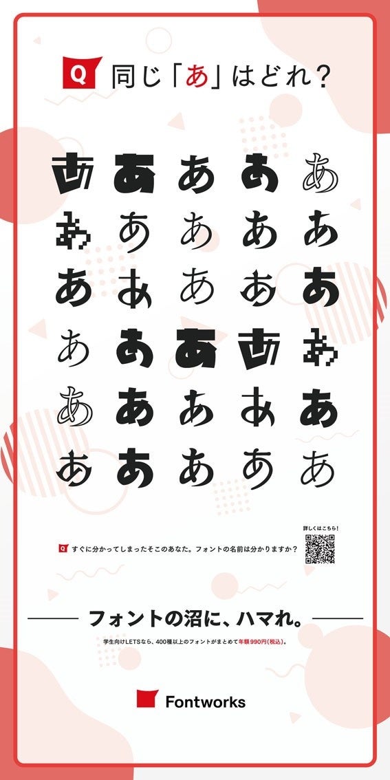 学生向けLETSは、デザインを学ぶ次世代クリエイターへの教育支援を目的とした年間定額制のフォントサービスです。年会費 990円(税込)で、プロデザイナーが使用する通常版と同じアプリケーション構成・バラエティ豊かなフォント・新書体も追加費用なしでお使いいただけます。在学中ならいつでもお申込みができ、卒業後もライセンス期間内であればお使いいただくことが可能です。