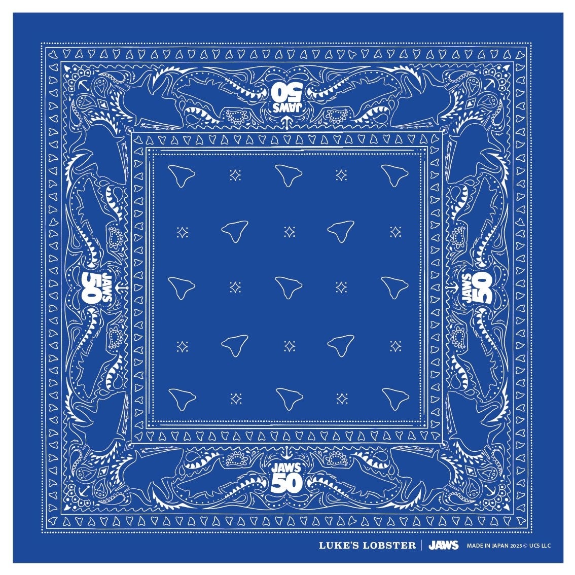 映画『ジョーズ』 (原題: JAWS) の50周年ロゴとLUKE'S LOBSTERのオリジナルデザイングッズです。ファン必見の限定グッズ第一弾は、タンブラーとトートバック。映画の世界観を身近に感じられるデザインで、コレクションとしても楽しめます。第二弾はブルーを基調とした、オリジナルのバンダナが登場します!