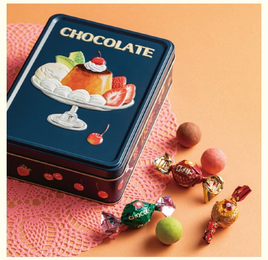 クリームソーダ、プリン、いちごパフェ、3種類の風味のキャンディインチョコレートの詰め合わせ。缶のフタにはエンボス加工を施し、イラストはぷっくりと立体的に盛り上がっています。
