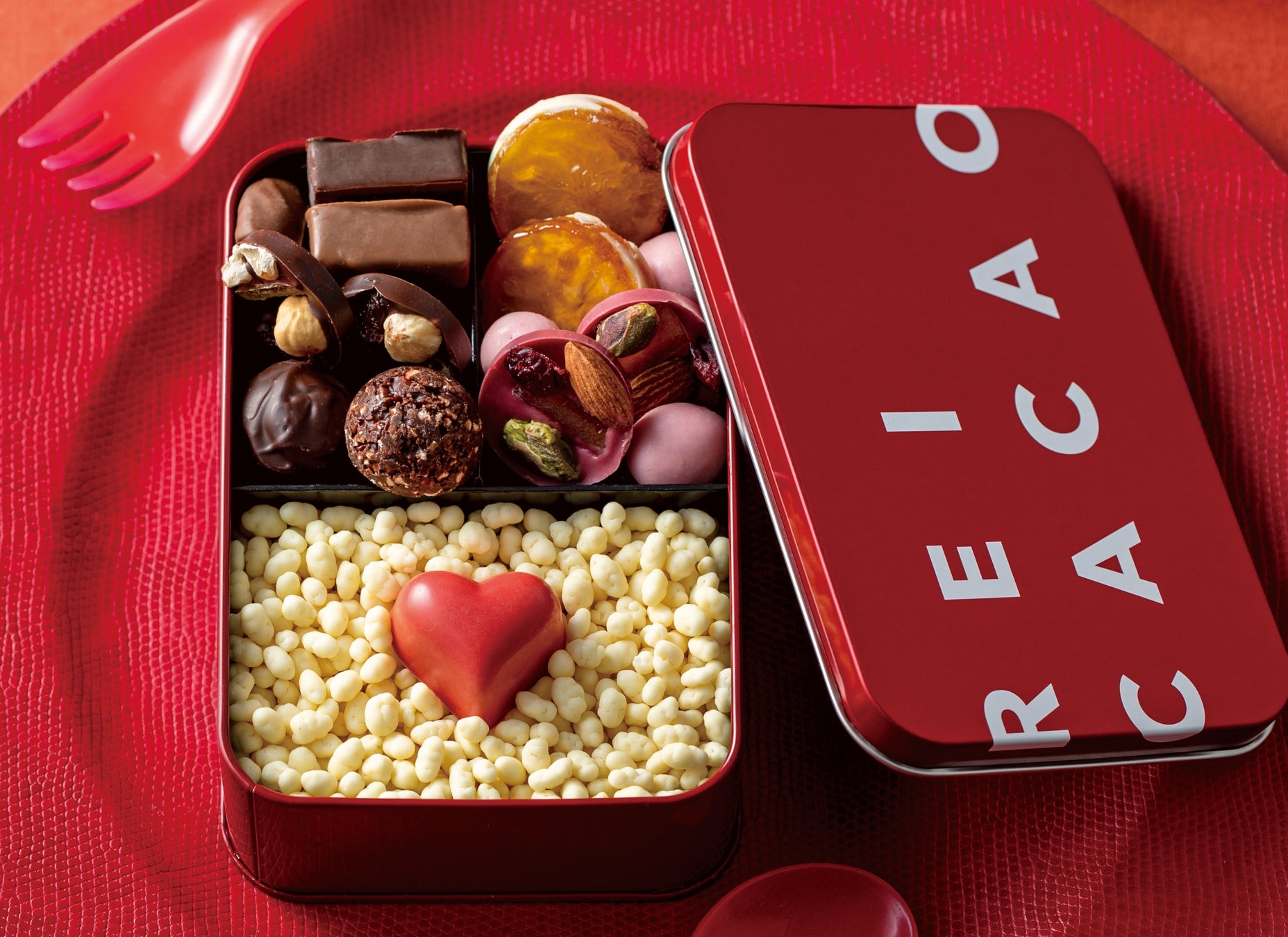 チョコレートなのにお弁当!? ライスパフやボンボンショコラを、ごはんと梅干しに見立てた一品。マンディアンやトリュフなど、本格ショコラ11種がぎっしり。