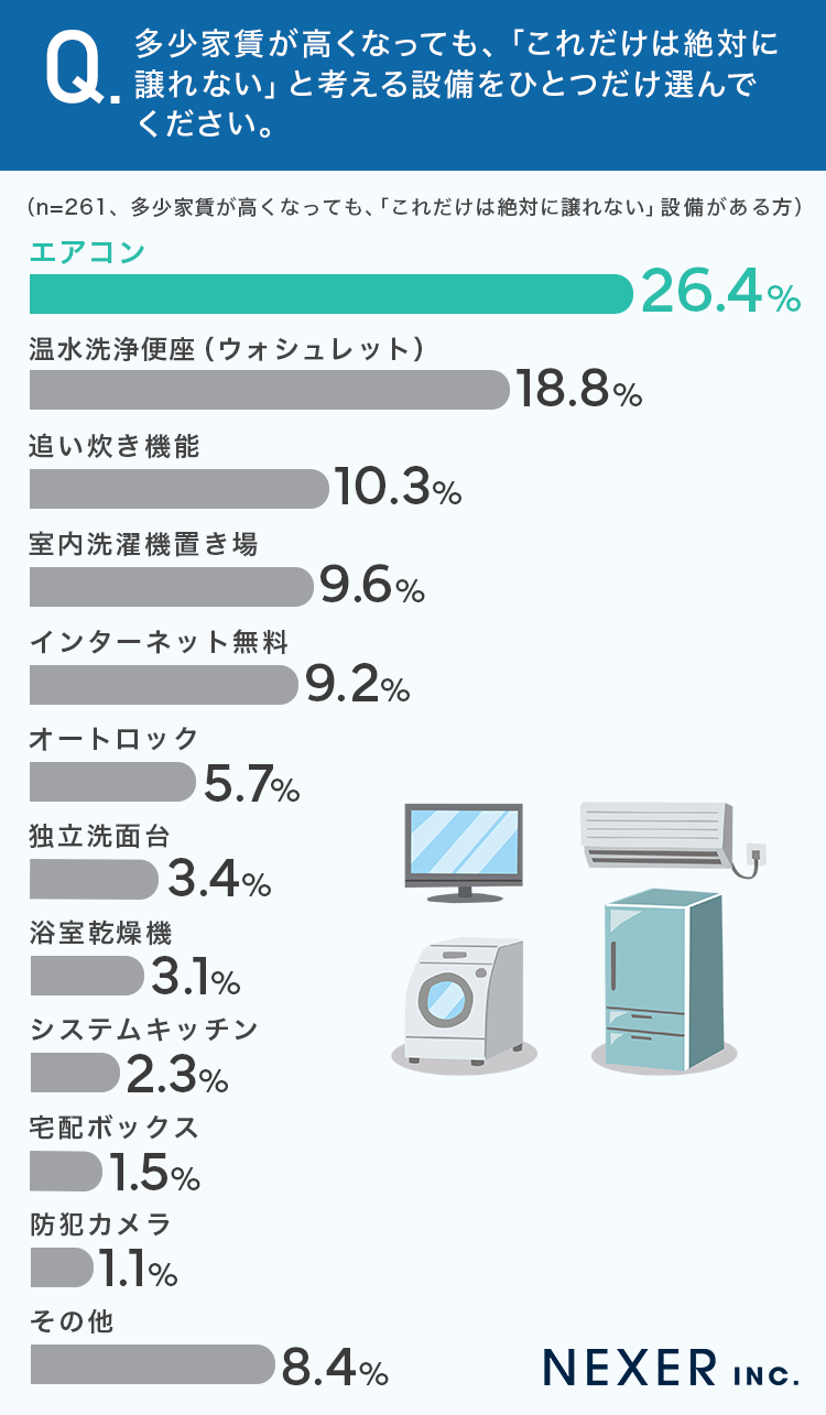 最も多かったのは「エアコン」で26.4%でした。次いで「温水洗浄便座(ウォシュレット)」が18.8%、「追い炊き機能」が10.3%、「室内洗濯機置き場」が9.6%、「インターネット無料」が9.2%と続きます。