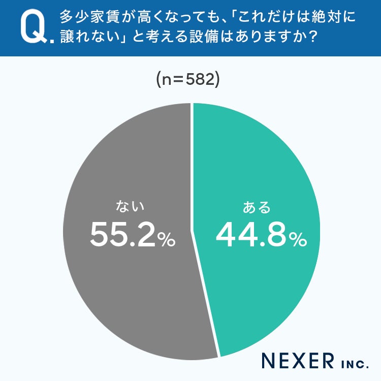 その結果「ある」と回答した方は44.8%、「ない」と回答した方は55.2%でした。約半数近くの方が、家賃が上がってでも譲れない設備があると考えていることがわかります。