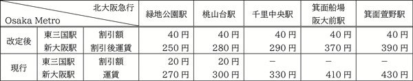 北大阪急行全線(箕面萱野駅から江坂駅)とOsaka Metro 1区(東三国駅、新大阪駅)間を乗車時にそれぞれの所定運賃の合算額から40円を差し引いた額を適用します。