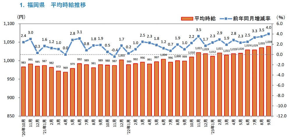 ■福岡県の平均時給は1,039円(前年同月999円、前月1,035円)