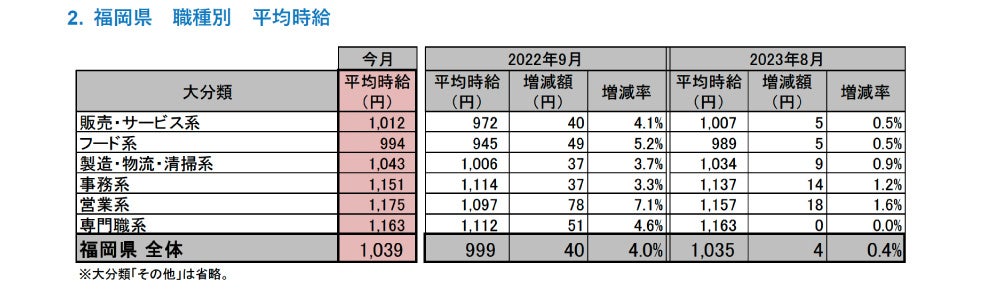 [福岡県版]2023年9月度 アルバイト・パート募集時平均時給調査 福岡県の9月度平均時給は前年同月より40円増加の1,039円