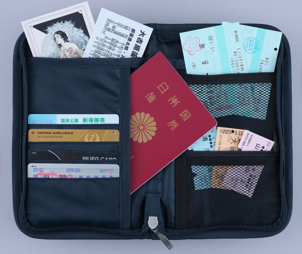 ファスナー式で、パスポートやきっぷ、展覧会などのチケット類、クレジットカードなどを安全に持ち歩ける。