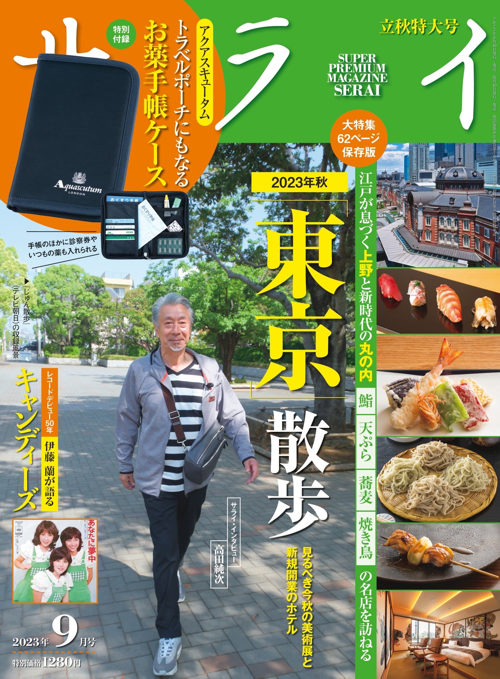 8月9日発売の『サライ』9月号の特別付録は、「『アクアスキュータム』トラベルポーチにもなるお薬手帳ケース」。