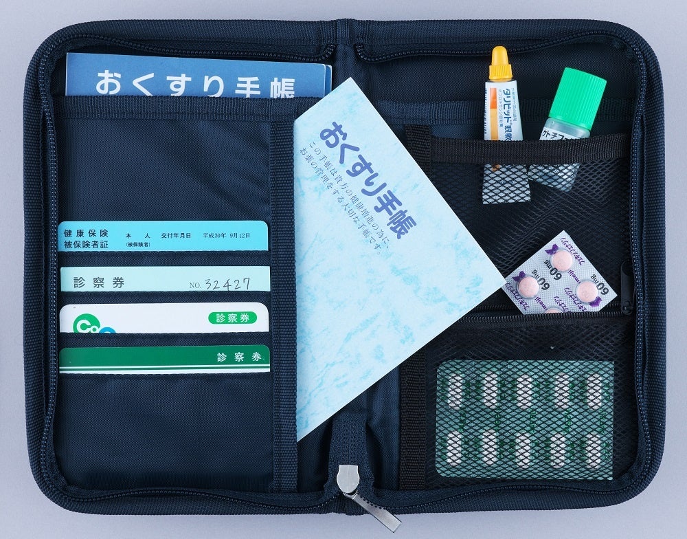 各種のポケットやカード入れに、診察券や日常薬などを入れて持ち歩ける。