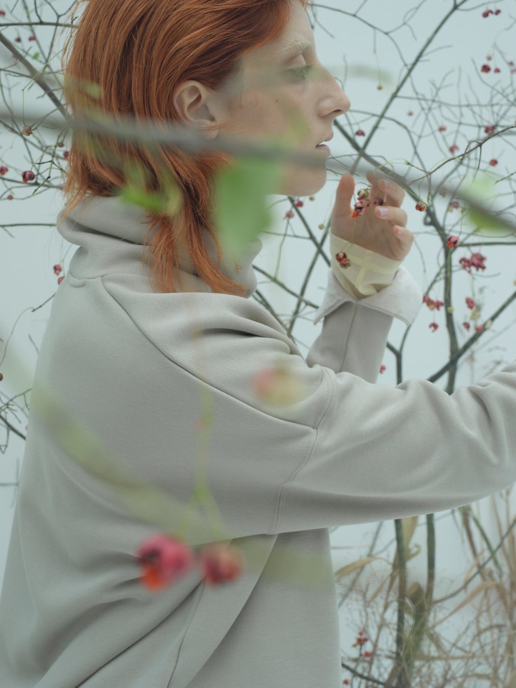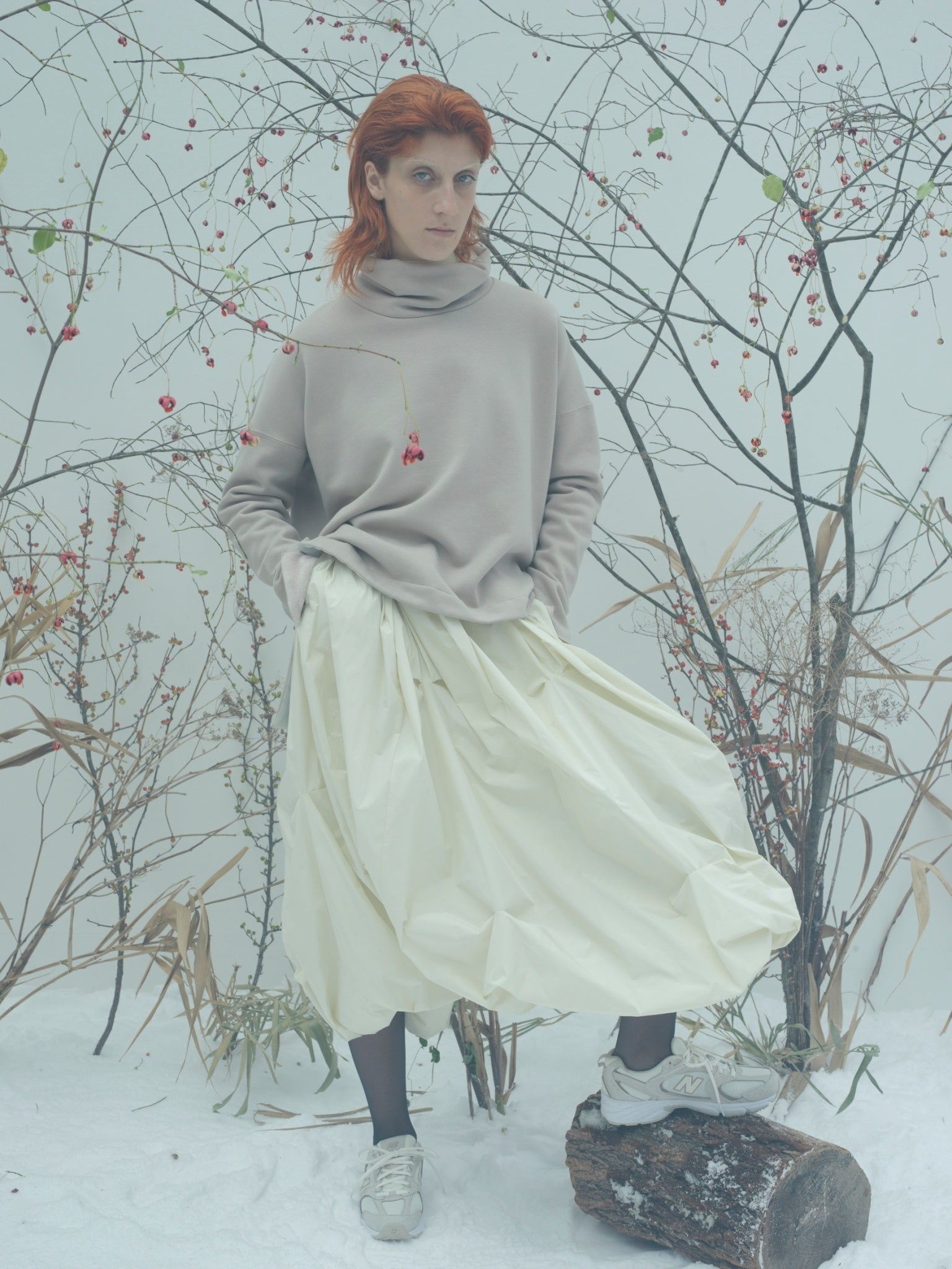 ボリュームあるハイネックの仕立てとゆったりしたシルエット、細身のフィットする袖口がスマートな印象に。
