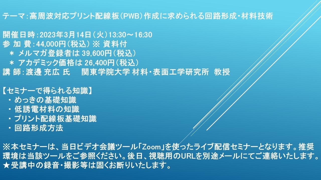 先端技術情報や市場情報を提供している(株)シーエムシー・リサーチ(千代田区神田錦町: https://cmcre.com/ )では、 各種材料・化学品などの市場動向・技術動向のセミナーや書籍発行を行っておりますが、 このたび「高周波対応プリント配線板(PWB)作成に求められる回路形成・材料技術」と題するセミナーを、 講師に渡邊 充広 氏 (関東学院大学 材料・表面工学研究所 教授)をお迎えし、2023年3月14日(火)13:30より、 ZOOMを利用したライブ配信で開催いたします。 受講料は、 一般:44,000円(税込)、 弊社メルマガ会員:39,600円(税込)、 アカデミック価格は26,400円(税込)となっております(資料付)。