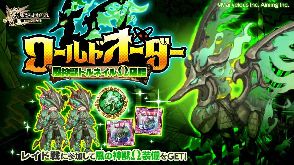 レイド戦で風神獣トルネイルΩに挑み、潜在能力解放が可能な「神獣トルネイルΩの覇装」などの報酬をGETしよう!