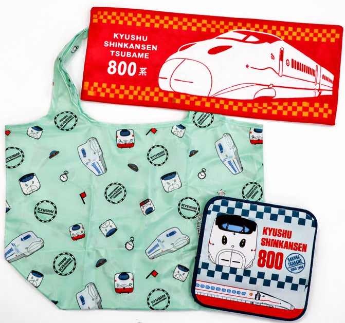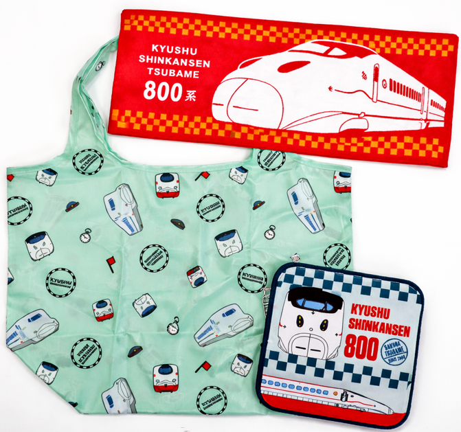 【内容】九州新幹線800系をモチーフにした、エコバッグ・タオルハンカチ・フェイスタオルを組み合わせたセット商品です。