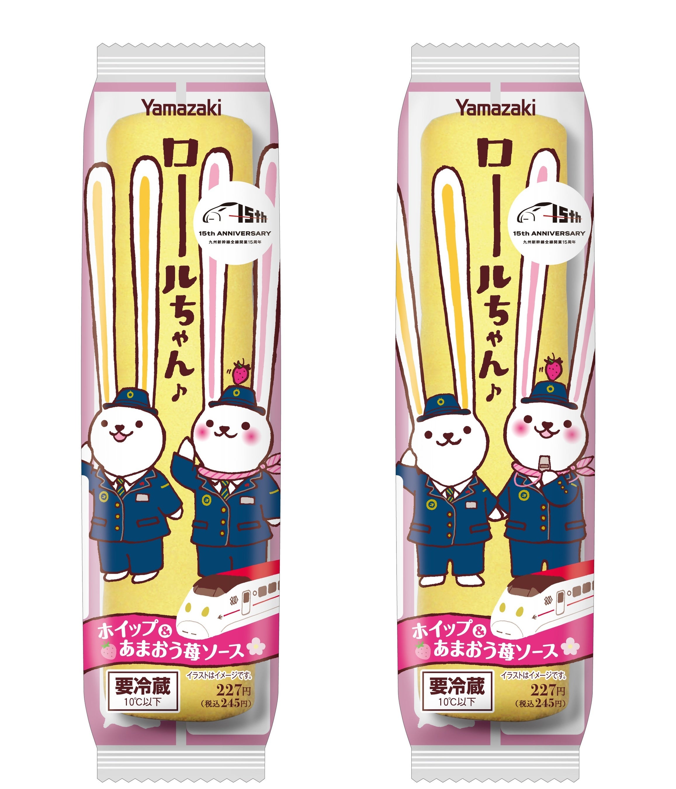 【内容】人気の「ロールちゃん」が、九州新幹線全線開業 15周年限定パッケージで登場。ホイップクリームに、福岡県産あまおう苺の濃縮果汁を使用したソースを組み合わせました。