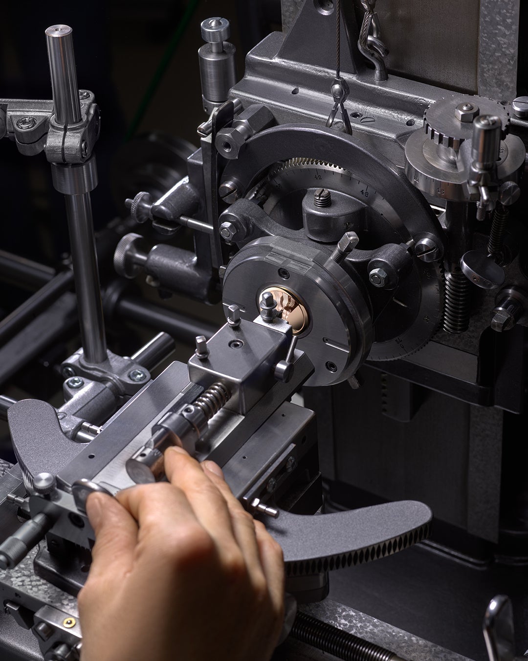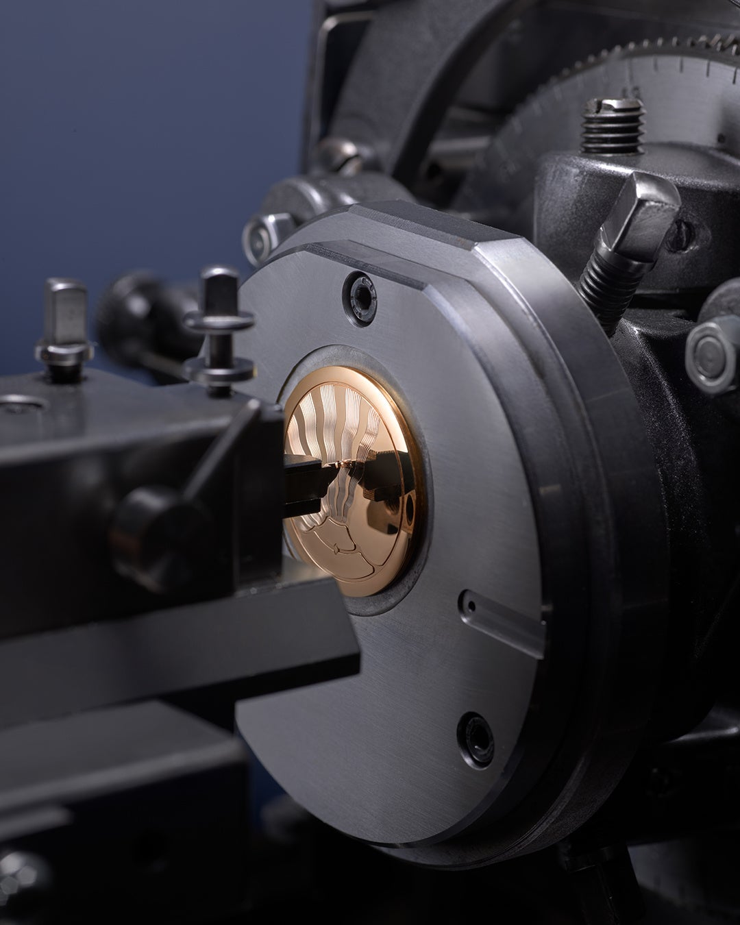 職人たちはこうした機械を使って、複数の感覚を同時に研ぎ澄ますことが必要とされる、高度な作業を行います。視覚を頼りに、金属表面の微細な変化を読み取りながら彫り進め、切削刃がゴールドを適切な深さで刻んでいるかを絶えず監視。また触覚も大切で、旋盤を通して指先に伝わる微妙な振動から、1つ1つの模様が理想とするギョーシェ模様を正確に刻んでいるかを確認しています。
