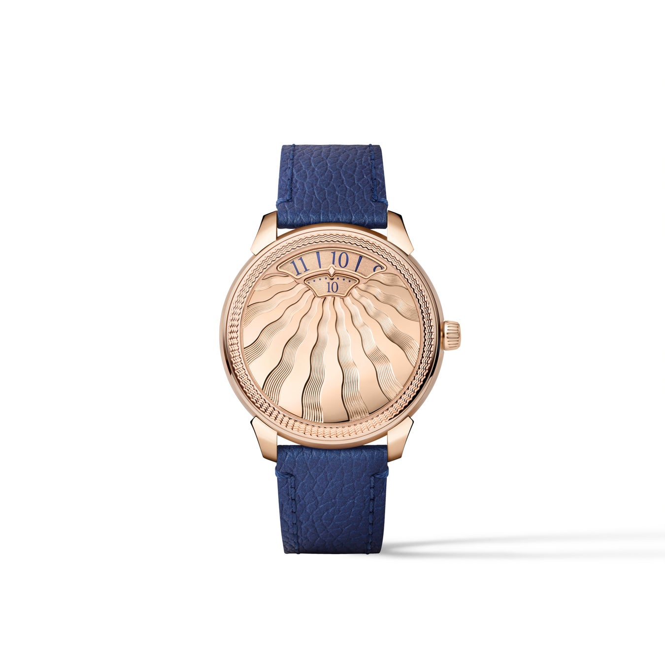 手動旋盤で彫られた2種類のギョーシェ模様があしらわれた「タンブール コンバージェンス ギョーシェ」は、ウォッチメイキングのメティエダールにおける自社の卓越した技術をさらに発展させていくという、ルイ·ヴィトンのコミットメントを受け継いでいます。光の輪のように広がる同心円状の波紋がローズゴールド製ケースの上面を彩り、プレシャスなプレートには新たな立体感が。ウォッチの中央には、時刻表示窓から広がる波打つ放射状の線が連なり、わずかにドーム型を帯びたケースに一層の深みと質感を添えています。