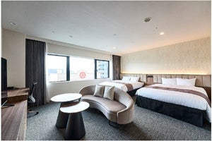 最上階に位置し、最大で大人3名様までご宿泊いただける客室です。約44㎡の広々とした空間に、幅154cmのベッド2台を備えています(別途エキストラベッド1台設置可)。バス・トイレは完全セパレートタイプで、洗面シンクは複数人でもゆったりと使えるダブルボウル仕様。中長期滞在にも便利にご利用いただけるオーブンレンジや冷凍庫付き冷蔵庫も備えています。