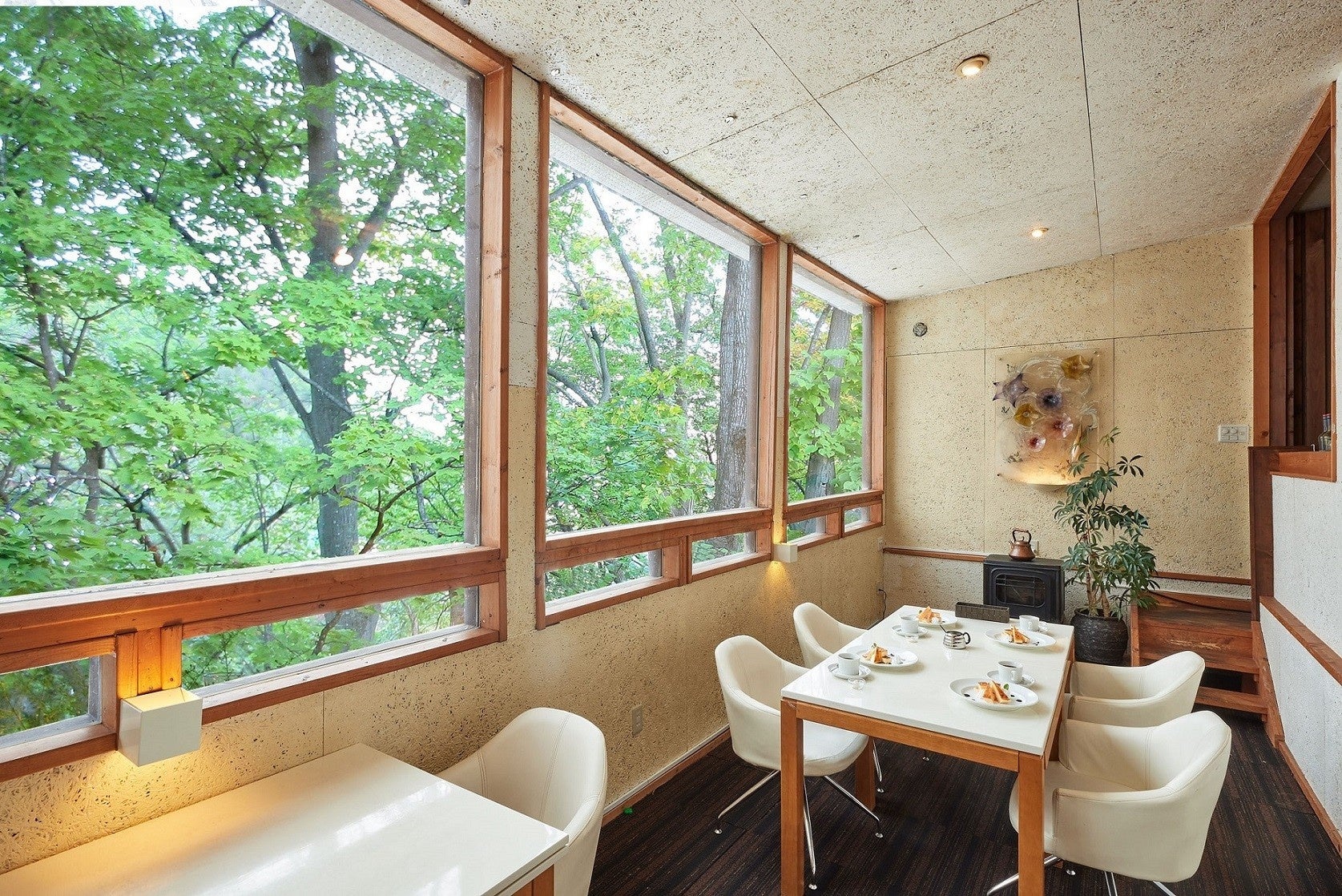 札幌の藻岩山山麓にある木々の囲まれたカフェ。窓いっぱいに広がる木立が、季節ごとにさまざまな表情を見せ、来店客を楽しませます。