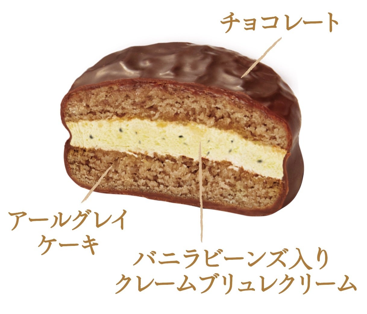 アールグレイパウダーを練り込んだしっとりケーキで、バニラビーンズ入りのクリームをサンドし、チョコレートでコーティング。