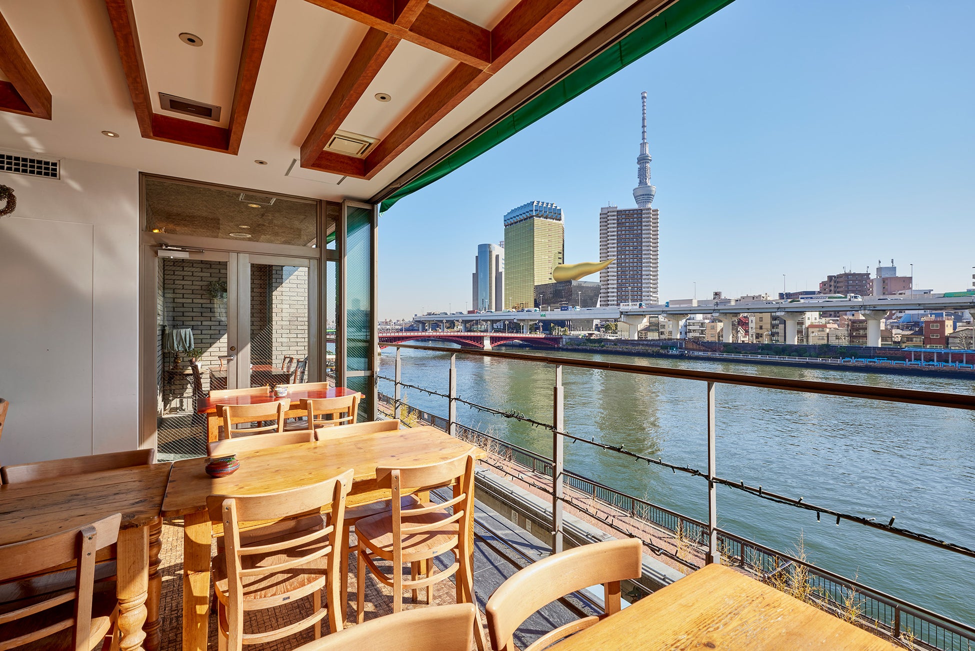 東京・浅草の隅田川沿いに建つ創業40年を超える老舗の喫茶店。大きな窓のある開放的な店内からはスカイツリーや吾妻橋、駒形橋が一望できます。昼間はカフェ、夜はレストランとして、地元の方はもちろん、観光客も多く訪れる、老若男女から愛されるお店です。